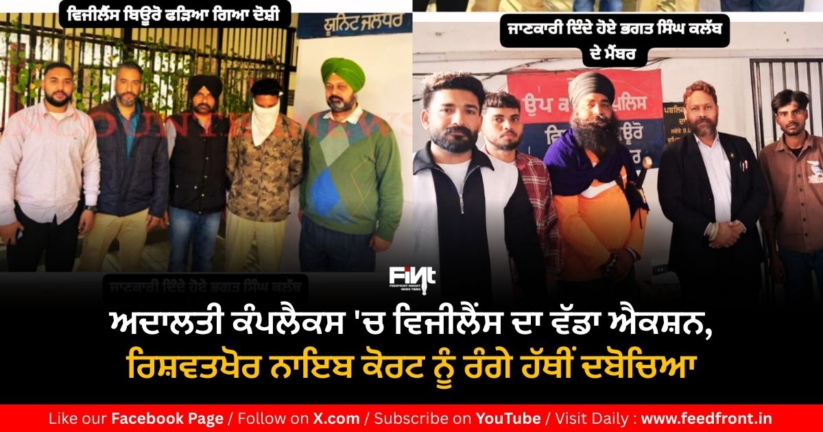 ਕਪੂਰਥਲਾ: ਪੰਜਾਬ ਵਿੱਚ ਭ੍ਰਿਸ਼ਟਾਚਾਰ ਵਿਰੁੱਧ ਵਿੱਢੀ ਮੁਹਿੰਮ ਤਹਿਤ ਅੱਜ ਵਿਜੀਲੈਂਸ ਬਿਊਰੋ ਨੇ ਇੱਕ ਵੱਡੀ ਸਫਲਤਾ ਹਾਸਲ ਕੀਤੀ ਹੈ। ਕਪੂਰਥਲਾ ਮੈਜਿਸਟ੍ਰੇਟ ਦੀ ਅਦਾਲਤ ਵਿੱਚ ਤਾਇਨਾਤ ਨਾਇਬ ਕੋਰਟ ਰਜਿੰਦਰ ਸਿੰਘ ਨੂੰ 8000 ਰੁਪਏ ਦੀ ਰਿਸ਼ਵਤ ਲੈਂਦੇ ਹੋਏ ਰੰਗੇ ਹੱਥੀਂ ਕਾਬੂ ਕੀਤਾ ਗਿਆ ਹੈ। ਇਹ ਕਾਰਵਾਈ ਸ਼ਹੀਦ-ਏ-ਆਜ਼ਮ ਸ. ਭਗਤ ਸਿੰਘ ਕਲੱਬ ਨਕੋਦਰ (ਜਲੰਧਰ) ਦੇ ਅਹੁਦੇਦਾਰਾਂ ਅਤੇ ਮੈਂਬਰਾਂ ਦੇ ਸੁਚੇਤ ਯਤਨਾਂ ਸਦਕਾ ਨੇਪਰੇ ਚੜ੍ਹੀ ਹੈ। ਕਲੱਬ ਦੇ ਪੰਜਾਬ ਪ੍ਰਧਾਨ ਐਡਵੋਕੇਟ ਗੌਰਵ ਨਾਗਰਾਜ ਅਤੇ ਤਹਿਸੀਲ ਪ੍ਰਧਾਨ ਹੈਪੀ ਖਾਲਸਾ ਨੇ ਦੱਸਿਆ ਕਿ ਦੋਸ਼ੀ ਮੁਲਾਜ਼ਮ ਪਿੰਡ ਸਹਿਮ ਦੇ ਇੱਕ ਮਜ਼ਦੂਰ ਪਰਿਵਾਰ ਨੂੰ ਲੰਬੇ ਸਮੇਂ ਤੋਂ ਪ੍ਰੇਸ਼ਾਨ ਕਰ ਰਿਹਾ ਸੀ।