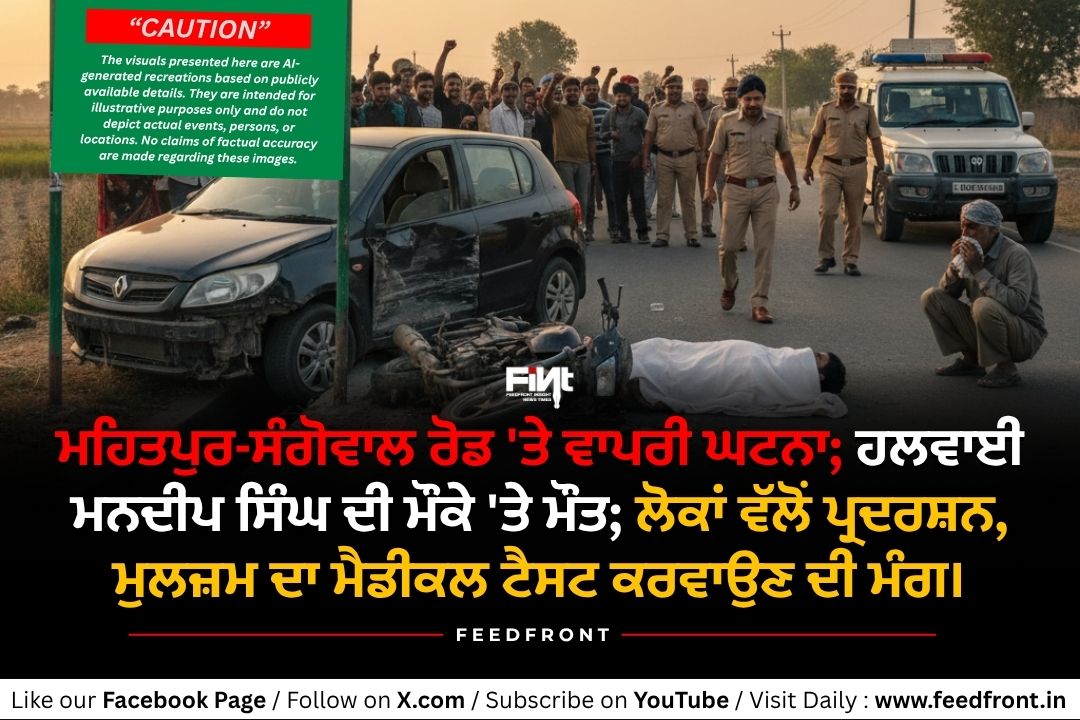 ਮਹਿਤਪੁਰ : ਜਲੰਧਰ ਜ਼ਿਲ੍ਹੇ ਦੇ ਮਹਿਤਪੁਰ-ਸੰਗੋਵਾਲ ਰੋਡ ‘ਤੇ ਐਤਵਾਰ ਨੂੰ ਵਾਪਰੇ ਇੱਕ ਦਿਲ ਕੰਬਾਊ ਸੜਕ ਹਾਦਸੇ ਵਿੱਚ ਇੱਕ ਨੌਜਵਾਨ ਦੀ ਮੌਕੇ ‘ਤੇ ਹੀ ਮੌਤ ਹੋ ਗਈ। ਦੱਸਿਆ ਜਾ ਰਿਹਾ ਹੈ ਕਿ ਹਾਦਸਾ ਉਸ ਸਮੇਂ ਵਾਪਰਿਆ ਜਦੋਂ ਸ਼ਰਾਬ ਦੇ ਨਸ਼ੇ ਵਿੱਚ ਧੁੱਤ ਇੱਕ ਪੁਲਿਸ ਕਰਮੀ ਨੇ ਆਪਣੀ ਤੇਜ਼ ਰਫ਼ਤਾਰ ਕਾਰ ਨਾਲ ਮੋਟਰਸਾਈਕਲ ਸਵਾਰ ਨੂੰ ਜ਼ੋਰਦਾਰ ਟੱਕਰ ਮਾਰ ਦਿੱਤੀ। ਟੱਕਰ ਦੀ ਸ਼ਿੱਦਤ ਇੰਨੀ ਜ਼ਿਆਦਾ ਸੀ ਕਿ ਮੋਟਰਸਾਈਕਲ ਸਵਾਰ ਨੌਜਵਾਨ ਨੇ ਮੌਕੇ ‘ਤੇ ਹੀ ਦਮ ਤੋੜ ਦਿੱਤਾ। ਮ੍ਰਿਤਕ ਦੀ ਪਛਾਣ ਮਨਦੀਪ ਸਿੰਘ ਪੁੱਤਰ ਮਹਿੰਦਰ ਸਿੰਘ ਨਿਵਾਸੀ ਮਹਿਤਪੁਰ ਵਜੋਂ ਹੋਈ ਹੈ, ਜੋ ਪੇਸ਼ੇ ਤੋਂ ਹਲਵਾਈ ਸੀ। ਜਾਣਕਾਰੀ ਅਨੁਸਾਰ, ਮਨਦੀਪ ਸਿੰਘ ਸਵੇਰੇ ਕਿਸੇ ਕੰਮ ਲਈ ਆਪਣੇ ਮੋਟਰਸਾਈਕਲ ‘ਤੇ ਨਿਕਲਿਆ ਸੀ। ਜਦੋਂ ਉਹ ਪੇਪਰ ਮਿੱਲ ਨੇੜੇ ਡਰੇਨ ਕੋਲ ਪਹੁੰਚਿਆ, ਤਾਂ ਪੁਲਿਸ ਕਰਮੀ ਸੁਖਦੀਪ ਸਿੰਘ, ਜੋ ਨਸ਼ੇ ਦੀ ਹਾਲਤ ਵਿੱਚ ਕਾਰ ਚਲਾ ਰਿਹਾ ਸੀ, ਨੇ ਉਸਨੂੰ ਟੱਕਰ ਮਾਰ ਦਿੱਤੀ।
