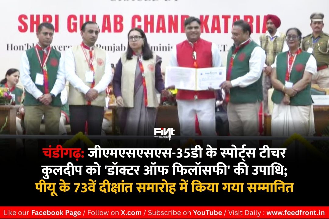 चंडीगढ़: पंजाब विश्वविद्यालय (पीयू) चंडीगढ़ के 73वें दीक्षांत समारोह में गवर्नमेंट मॉडल सीनियर सेकेंडरी स्कूल, सेक्टर-35/डी चंडीगढ़ के डीपीई (स्पोर्ट्स टीचर) कुलदीप को “डॉक्टर ऑफ फिलॉसफी” (पीएचडी) की उपाधि से सम्मानित किया गया। कुलदीप को यह सम्मान पंजाब विश्वविद्यालय की कुलपति प्रोफेसर रेणु विग एवं डीन एजुकेशन प्रोफेसर गुरमीत सिंह ने प्रदान किया।