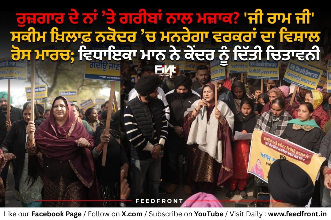 ਨਕੋਦਰ/ਨੂਰਮਹਿਲ: ਕੇਂਦਰ ਦੀ ਭਾਜਪਾ ਸਰਕਾਰ ਵੱਲੋਂ ਮਨਰੇਗਾ ਸਕੀਮ ਦੇ ਸਰੂਪ ਵਿੱਚ ਕੀਤੇ ਗਏ ਬਦਲਾਅ ਅਤੇ ‘ਜੀ ਰਾਮ ਜੀ’ (G-RAM-G) ਨਾਮੀ ਨਵੀਂ ਸਕੀਮ ਲਿਆਉਣ ਦੇ ਵਿਰੋਧ ਵਿੱਚ ਅੱਜ ਨਕੋਦਰ ਦੀਆਂ ਸੜਕਾਂ ’ਤੇ ਮਨਰੇਗਾ ਵਰਕਰਾਂ ਦਾ ਹੜ੍ਹ ਆ ਗਿਆ। ਹਲਕਾ ਵਿਧਾਇਕਾ ਇੰਦਰਜੀਤ ਕੌਰ ਮਾਨ ਦੀ ਅਗਵਾਈ ਹੇਠ ਕੱਢੇ ਗਏ ਇਸ ਵਿਸ਼ਾਲ ਰੋਸ ਮਾਰਚ ਵਿੱਚ ਹਜ਼ਾਰਾਂ ਦੀ ਗਿਣਤੀ ਵਿੱਚ ਮਨਰੇਗਾ ਵਰਕਰਾਂ, ਖ਼ਾਸ ਕਰਕੇ ਔਰਤਾਂ ਨੇ ਸ਼ਮੂਲੀਅਤ ਕਰਦਿਆਂ ਕੇਂਦਰ ਸਰਕਾਰ ਵਿਰੁੱਧ ਤਿੱਖਾ ਹੱਲਾ ਬੋਲਿਆ।