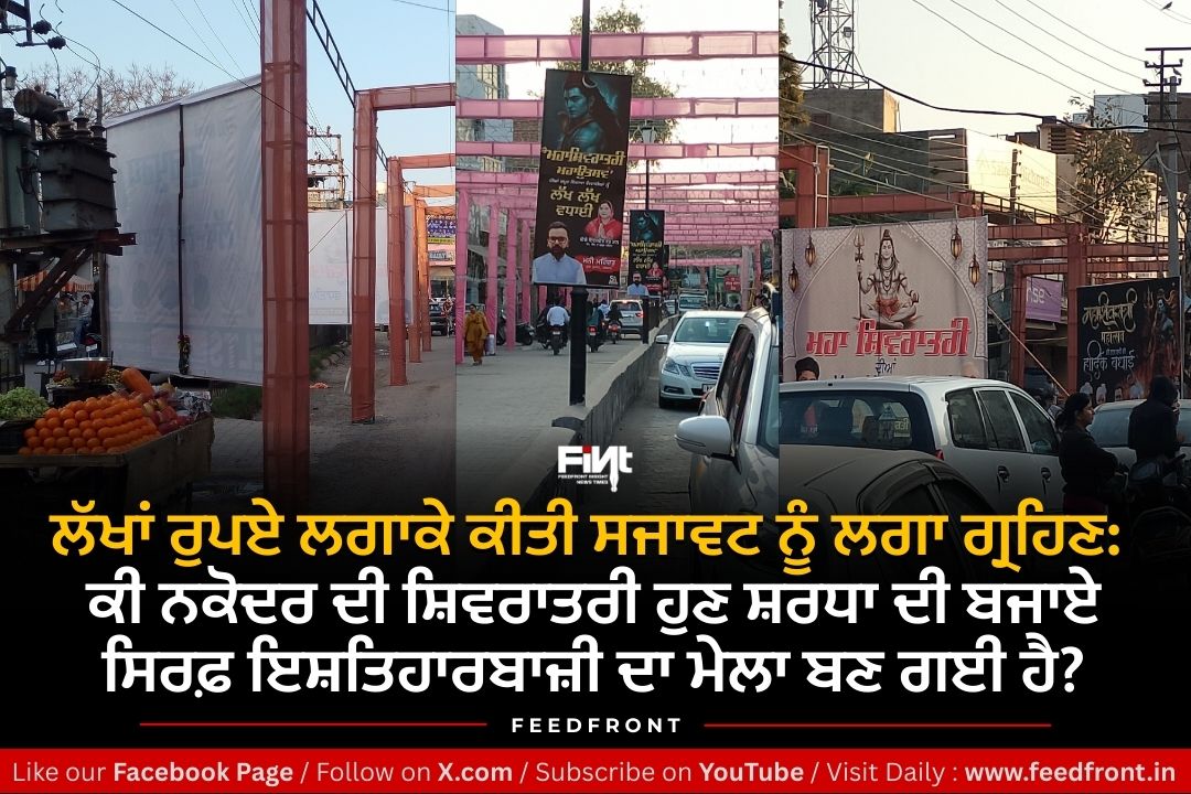 ਸੰਪਾਦਕੀ ਟਿੱਪਣੀ: ਧਾਰਮਿਕ ਸਮਾਗਮਾਂ ਵਿੱਚ ਸਜਾਵਟ ਦਾ ਮਕਸਦ ਸ਼ਰਧਾ ਅਤੇ ਅਧਿਆਤਮਿਕ ਮਾਹੌਲ ਪੈਦਾ ਕਰਨਾ ਹੁੰਦਾ ਹੈ, ਨਾ ਕਿ ਕਿਸੇ ਦੀ ਸਿਆਸੀ ਅਕਸ ਬਣਾਉਣ ਲਈ ਮੰਚ ਪ੍ਰਦਾਨ ਕਰਨਾ। ਨਕੋਦਰ ਵਿੱਚ ਸਜਾਵਟੀ ਪਿਲਰਾਂ ‘ਤੇ ਲੱਗੇ ਵਿਸ਼ਾਲ ਬੋਰਡ ਇਸ ਗੱਲ ਦਾ ਪ੍ਰਮਾਣ ਹਨ ਕਿ ਕਿਵੇਂ ਨਿੱਜੀ ਇੱਛਾਵਾਂ ਜਨਤਕ ਸ਼ਰਧਾ ‘ਤੇ ਹਾਵੀ ਹੋ ਰਹੀਆਂ ਹਨ। ਸ਼ਿਵਰਾਤਰੀ ਕਮੇਟੀ ਨੂੰ ਇਸ ਮਾਮਲੇ ਵਿੱਚ ਸਖ਼ਤ ਸਟੈਂਡ ਲੈਣਾ ਚਾਹੀਦਾ ਹੈ, ਕਿਉਂਕਿ ਜਦੋਂ ਭਗਤੀ ਦੇ ਪ੍ਰਤੀਕਾਂ ਨੂੰ ਵਿਅਕਤੀਗਤ ਪ੍ਰਚਾਰ ਲਈ ਵਰਤਿਆ ਜਾਂਦਾ ਹੈ, ਤਾਂ ਉਸ ਤਿਉਹਾਰ ਦੀ ਪਵਿੱਤਰਤਾ ਅਤੇ ਸੁੰਦਰਤਾ ਦੋਵੇਂ ਹੀ ਦਮ ਤੋੜ ਦਿੰਦੀਆਂ ਹਨ। ਪ੍ਰਸ਼ਾਸਨ ਨੂੰ ਵੀ ਚਾਹੀਦਾ ਹੈ ਕਿ ਸਜਾਵਟ ਦੇ ਨਾਂ ‘ਤੇ ਕੀਤੀ ਗਈ ਇਸ ਦਖ਼ਲਅੰਦਾਜ਼ੀ ਨੂੰ ਹਟਾ ਕੇ ਸ਼ਹਿਰ ਦੀ ਅਸਲੀ ਰੌਣਕ ਬਹਾਲ ਕਰੇ।