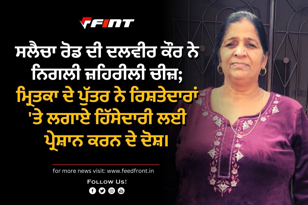 ਮ੍ਰਿਤਕ ਔਰਤ ਦੇ ਪੁੱਤਰ ਸੁਖਰਾਜ ਸਿੰਘ ਨੇ ਪੁਲਿਸ ਨੂੰ ਦਿੱਤੇ ਬਿਆਨ ਵਿੱਚ ਦੱਸਿਆ ਕਿ ਉਨ੍ਹਾਂ ਦੇ ਕੁਝ ਰਿਸ਼ਤੇਦਾਰ ਉਨ੍ਹਾਂ ਦੇ ਘਰ ਅਤੇ ਦੁਕਾਨ ਵਿੱਚ ਹਿੱਸਾ ਮੰਗਦੇ ਸਨ ਅਤੇ ਇਸ ਗੱਲ ਨੂੰ ਲੈ ਕੇ ਅਕਸਰ ਝਗੜਾ ਕਰਦੇ ਸਨ। ਉਨ੍ਹਾਂ ਦੱਸਿਆ ਕਿ ਇਸੇ ਕਾਰਨ ਉਨ੍ਹਾਂ ਦੀ ਮਾਤਾ ਦਲਵੀਰ ਕੌਰ ਲੰਬੇ ਸਮੇਂ ਤੋਂ ਪ੍ਰੇਸ਼ਾਨ ਰਹਿੰਦੀ ਸੀ। ਸੁਖਰਾਜ ਸਿੰਘ ਅਨੁਸਾਰ, ਅੱਜ ਸਵੇਰੇ ਕਰੀਬ 6 ਵਜੇ ਜਦੋਂ ਉਹ ਕਮਰੇ ਵਿੱਚ ਗਏ ਤਾਂ ਉਨ੍ਹਾਂ ਨੇ ਆਪਣੀ ਮਾਤਾ ਨੂੰ ਬੇਹੋਸ਼ੀ ਦੀ ਹਾਲਤ ਵਿੱਚ ਦੇਖਿਆ। ਤੁਰੰਤ ਉਨ੍ਹਾਂ ਨੂੰ ਸ਼ਾਹਕੋਟ ਦੇ ਇੱਕ ਨਿੱਜੀ ਹਸਪਤਾਲ ਲਿਜਾਇਆ ਗਿਆ। ਜਿੱਥੇ ਹਾਲਤ ਗੰਭੀਰ ਦੇਖਦਿਆਂ ਡਾਕਟਰਾਂ ਨੇ ਉਨ੍ਹਾਂ ਨੂੰ ਸਿਵਲ ਹਸਪਤਾਲ ਨਕੋਦਰ ਰੈਫਰ ਕਰ ਦਿੱਤਾ, ਪਰ ਉੱਥੇ ਪਹੁੰਚਦਿਆਂ ਹੀ ਉਨ੍ਹਾਂ ਦੀ ਮੌਤ ਹੋ ਗਈ। ਸੁਖਰਾਜ ਨੇ ਪੁਲਿਸ ਨੂੰ ਦੱਸਿਆ ਕਿ ਉਨ੍ਹਾਂ ਦੀ ਮਾਤਾ ਨੇ ਪਰਿਵਾਰਕ ਝਗੜੇ ਤੋਂ ਤੰਗ ਆ ਕੇ ਹੀ ਇਹ ਖੌਫਨਾਕ ਕਦਮ ਚੁੱਕਿਆ।