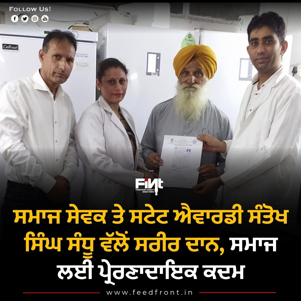 ਚੰਡੀਗੜ੍ਹ: ਸਮਾਜ ਸੇਵਾ ਅਤੇ ਮਨੁੱਖਤਾ ਦੀ ਭਲਾਈ ਲਈ ਆਪਣੀ ਜ਼ਿੰਦਗੀ ਸਮਰਪਿਤ ਕਰਨ ਵਾਲੇ ਮਸ਼ਹੂਰ ਸਮਾਜ ਸੇਵਕ ਅਤੇ ਸਟੇਟ ਐਵਾਰਡੀ ਸੰਤੋਖ ਸਿੰਘ ਸੰਧੂ ਨੇ ਅੱਜ ਆਪਣੀ ਮਰਨ ਉਪਰੰਤ ਇੱਛਾ ਅਨੁਸਾਰ ਪੀ.ਜੀ.ਆਈ. ਚੰਡੀਗੜ੍ਹ (Post Graduate Institute of Medical Education and Research) ਵਿੱਚ ਆਪਣਾ ਸਰੀਰ ਦਾਨ ਕਰ ਦਿੱਤਾ। ਇਹ ਮਾਨਵਤਾ ਭਰਿਆ ਕਦਮ ਉਨ੍ਹਾਂ ਵੱਲੋਂ ਇਕ ਐਸਾ ਪ੍ਰੇਰਣਾਦਾਇਕ ਸੰਦੇਸ਼ ਹੈ ਜੋ ਹੋਰ ਲੋਕਾਂ ਨੂੰ ਵੀ ਸਮਾਜਿਕ ਭਲਾਈ ਅਤੇ ਵਿਗਿਆਨਕ ਰਿਸਰਚ ਵੱਲ ਪ੍ਰੇਰਿਤ ਕਰੇਗਾ।