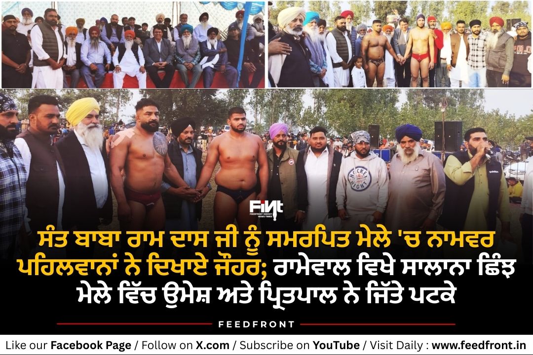 ਨੂਰਮਹਿਲ: ਇੱਥੋਂ ਦੇ ਪਿੰਡ ਰਾਮੇਵਾਲ ਵਿਖੇ ਲੱਖਾਂ ਦੇ ਦਾਤੇ ਅਤੇ ਸੰਤ ਬਾਬਾ ਰਾਮ ਦਾਸ ਜੀ ਨੂੰ ਸਮਰਪਿਤ ਸਲਾਨਾ ਛਿੰਝ ਮੇਲਾ ਬੜੇ ਉਤਸ਼ਾਹ ਨਾਲ ਕਰਵਾਇਆ ਗਿਆ। ਇਸ ਛਿੰਝ ਮੇਲੇ ਵਿੱਚ ਦੂਰ-ਦੂਰ ਤੋਂ ਪਹੁੰਚੇ ਪਹਿਲਵਾਨਾਂ ਨੇ ਆਪਣੇ ਜੌਹਰ ਵਿਖਾਏ ਅਤੇ ਦਰਸ਼ਕਾਂ ਦਾ ਮਨੋਰੰਜਨ ਕੀਤਾ।