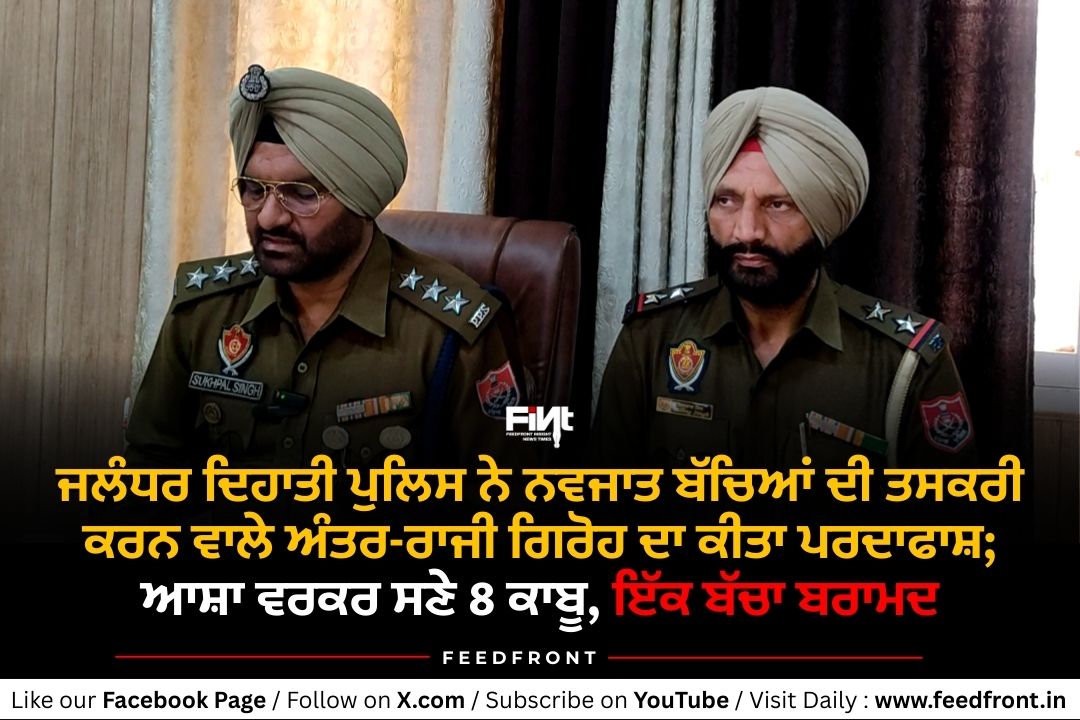 ਨਕੋਦਰ/ਜਲੰਧਰ: ਜਲੰਧਰ ਦਿਹਾਤੀ ਪੁਲਿਸ ਨੇ ਇੱਕ ਵੱਡੀ ਸਫਲਤਾ ਹਾਸਲ ਕਰਦਿਆਂ ਨਵਜਾਤ ਬੱਚਿਆਂ ਦੀ ਖਰੀਦੋ-ਫਰੋਖਤ ਅਤੇ ਤਸਕਰੀ ਕਰਨ ਵਾਲੇ ਇੱਕ ਸਰਗਰਮ ਅੰਤਰ-ਰਾਜੀ ਗਿਰੋਹ ਦਾ ਪਰਦਾਫਾਸ਼ ਕੀਤਾ ਹੈ। ਥਾਣਾ ਸਦਰ ਨਕੋਦਰ ਦੀ ਪੁਲਿਸ ਨੇ ਕਾਰਵਾਈ ਕਰਦਿਆਂ ਇਸ ਗਿਰੋਹ ਦੇ ਕੁੱਲ ਅੱਠ ਮੈਂਬਰਾਂ ਨੂੰ ਗ੍ਰਿਫਤਾਰ ਕੀਤਾ ਹੈ, ਜਿਨ੍ਹਾਂ ਪਾਸੋਂ ਤਸਕਰੀ ਕੀਤਾ ਜਾ ਰਿਹਾ ਇੱਕ ਨਵਜਾਤ ਬੱਚਾ (ਲੜਕਾ) ਵੀ ਸੁਰੱਖਿਅਤ ਬਰਾਮਦ ਕਰ ਲਿਆ ਗਿਆ ਹੈ। ਹੈਰਾਨੀ ਦੀ ਗੱਲ ਇਹ ਹੈ ਕਿ ਇਸ ਗੋਰਖਧੰਦੇ ਵਿੱਚ ਇੱਕ ਆਸ਼ਾ ਵਰਕਰ, ਇੱਕ ਅਦਾਲਤੀ ਕਰਮਚਾਰੀ ਅਤੇ ਇੱਕ ‘ਐੱਗ ਡੋਨਰ’ ਮਹਿਲਾ ਵੀ ਸ਼ਾਮਲ ਸੀ।